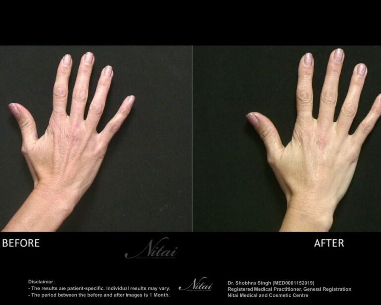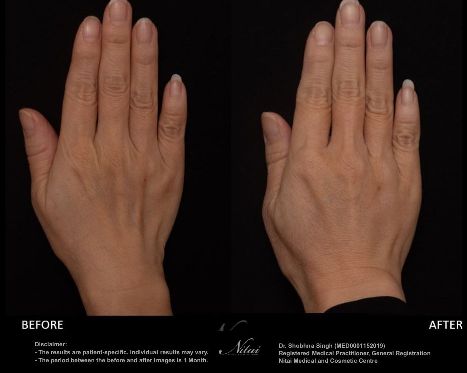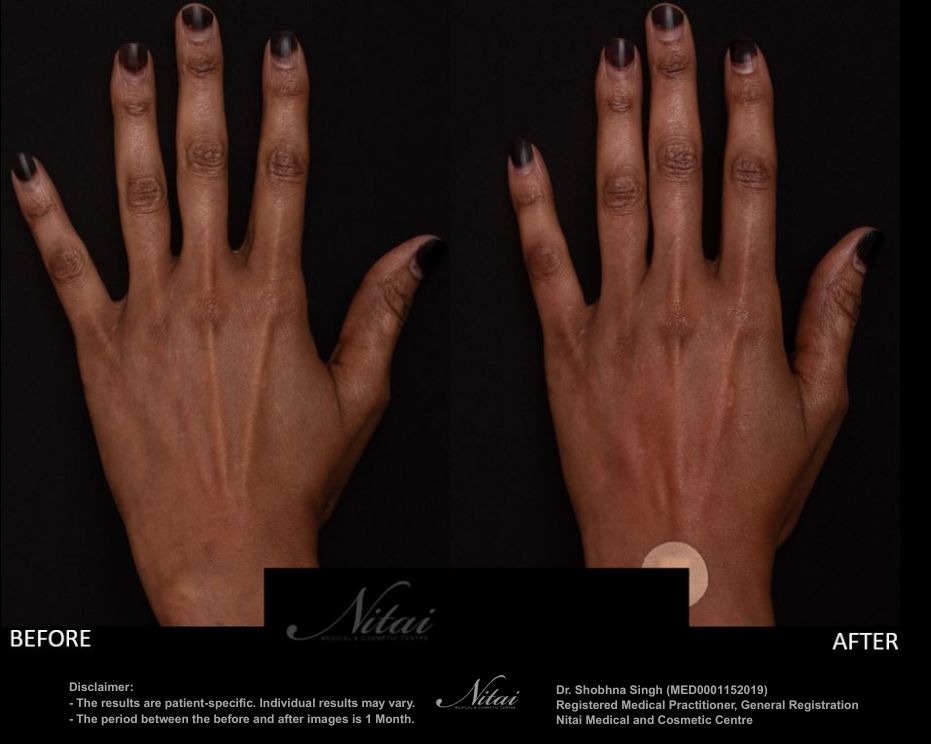 Hand rejuvenation with dermal enhancements is a non-surgical aesthetic procedure that takes only 15 to 20 minutes. It is performed by experienced aesthetic physician Dr. Shobhna Singh (MED0001152019), Registered Medical Practitioner, General Registration, at Nitai Medical and Cosmetic Centre.