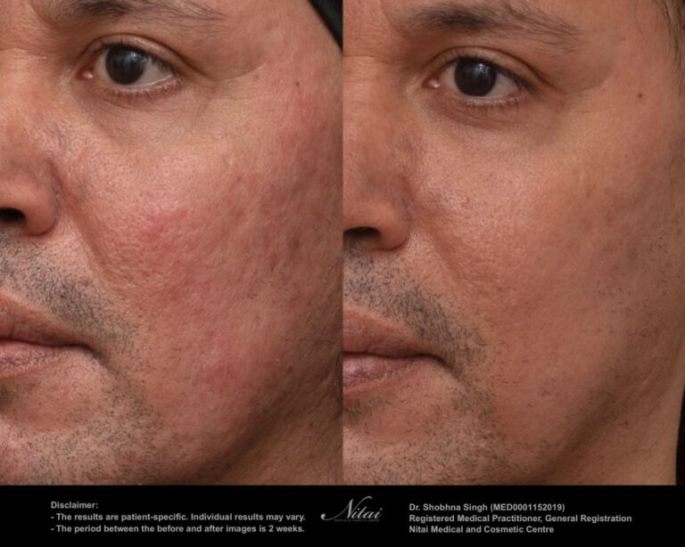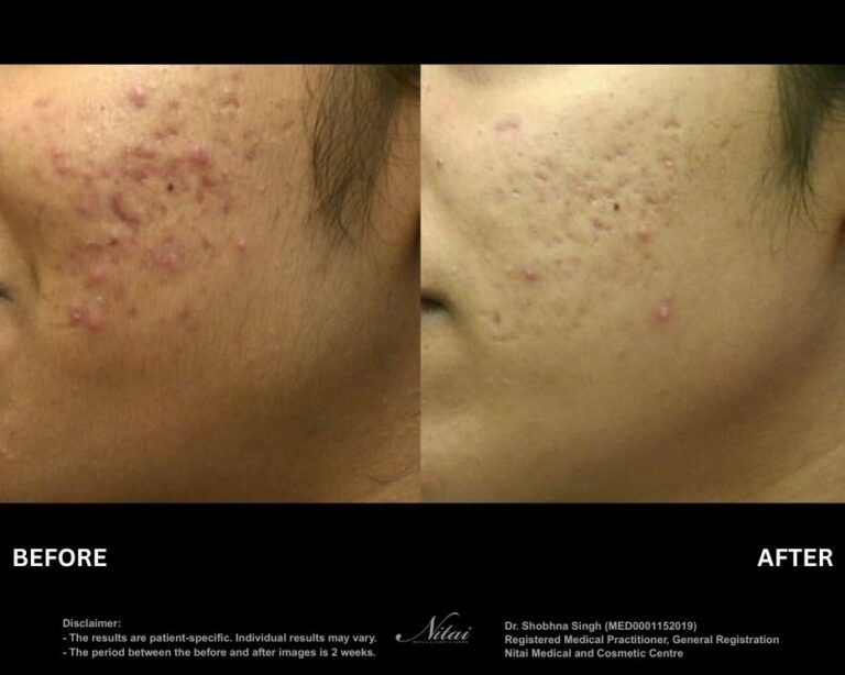 This next young female patient with dark skin presented with severe active acne. She was treated with Skincare Products compatible with her skin as prescribed by Dr. Shobhna Singh and also received a course of 4 Isolaz Acne Therapy treatments. A significant reduction in active acne was noticed. The remaining acne scars could be treated with Fraxel Laser.