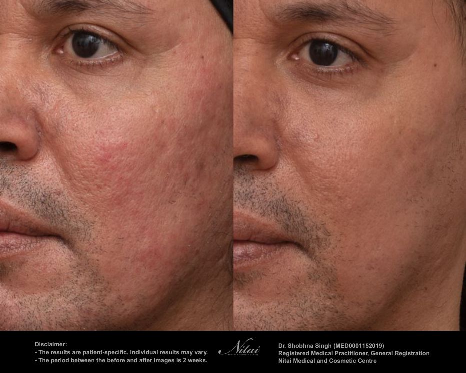 This next young male patient with of Middle Easter origin presented with severe active acne. Dr. Shobhna Singh prescribed skincare products compatible with the patient’s skin type and a course of 4 Isolaz Acne Therapy treatments resulting in a significant reduction in active acne. Fraxel Laser could be used to treatment the acne scars once the acne issue has been addressed.
